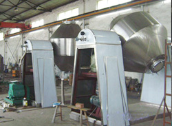 本設(shè)備,可用于制藥,化工、輕工、機(jī)械電子,礦治,國防工業(yè),農(nóng)牧業(yè),科研等企業(yè)單位的,粉狀,粒狀物料干燥混合專用。雙錐回轉(zhuǎn)真空干燥機(jī)是將被干燥的物料處于真空條件下進(jìn)行加熱干燥,它是利用真空泵對(duì)罐內(nèi)進(jìn)行抽氣、抽濕。向罐體夾套內(nèi)輸入蒸汽進(jìn)行加熱,熱量通過罐體壁與濕物料接觸,物料吸熱后所蒸發(fā)的水汽由真空泵經(jīng)真空排氣管道抽走。由于罐體內(nèi)的物料處于真空狀態(tài)下,物料的沸點(diǎn)降低,且罐體不斷做回轉(zhuǎn)運(yùn)動(dòng),使物料上、下、內(nèi)、外翻動(dòng),故加快了物料的干燥速度,提高了干燥速率,達(dá)到均勻、充分干燥的目的。